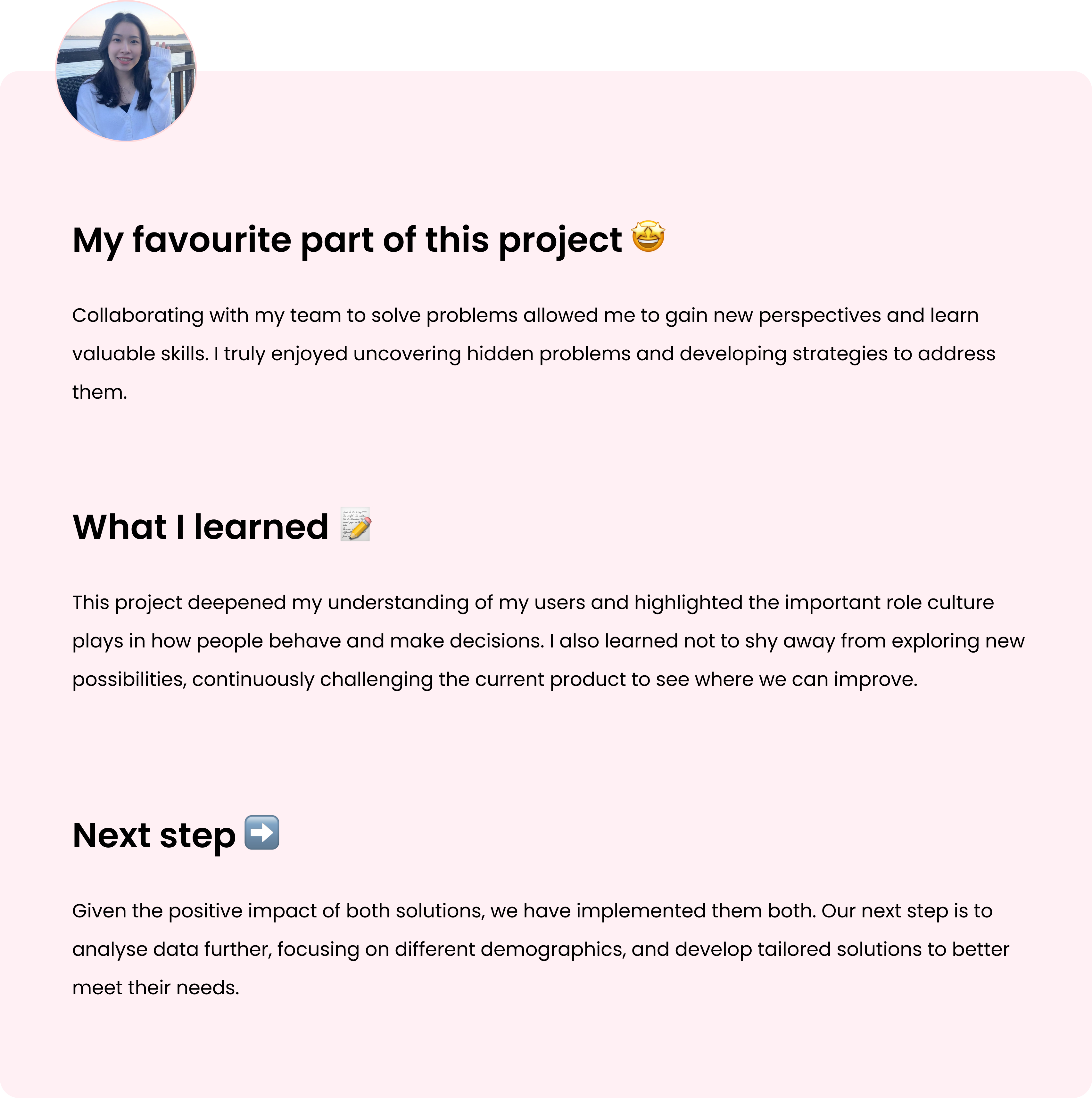 To effectively track the impact of different solutions, we collaborated and decided to release the icon change for female users across all markets, starting with a single device. This strategic approach allowed us to closely monitor results before implementing further changes, while also developing the the learning your preference design